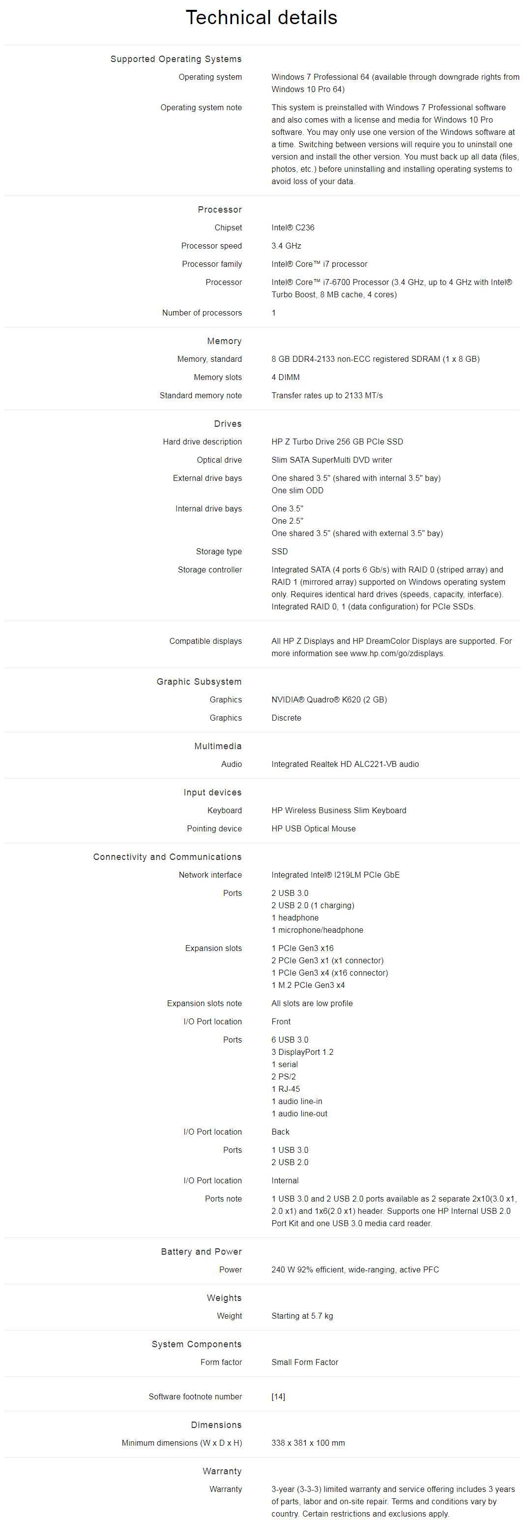 HP Z240 SFF Workstation PC i7-6700 8GB 256SSD K620 [V1Z84PA]